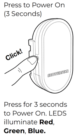 To turn on your ShowerStar, press and hold the operation button for 3 seconds. The LEDs will illuminate RED, GREEN, and BLUE to confirm the device is on.