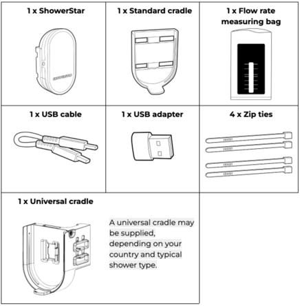 Here is a full checklist of the components included with your ShowerStar delivery to help you get set up quickly. Everything you need for the simple 2-minute DIY install is included, requiring no tools or plumber.